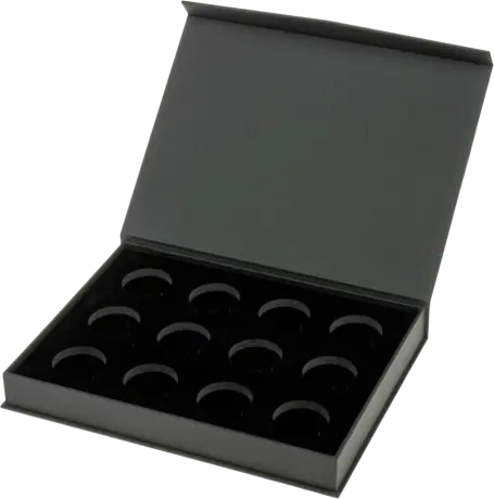 Obsahuje 12 slotů, ve kterých jsou vaše mince optimálně a bezpečně uloženy. Praktické zapuštěné úchyty krabičky usnadňují vkládání a vyjímání mincí. Vnitřek je podšitý měkkým černým sametem, takže mince jsou optimálně chráněny před poškrábáním. Magnetické a dobře utěsněné víko snadno otevřete jen mírným tlakem.